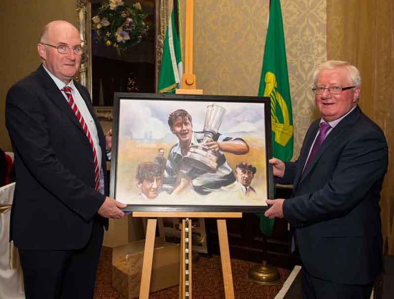 Leinster Council chairperson, John Horan presenting Michael Delaney (CEO Comhairle Laigheann) with his specially commissioned painting on the occasion of his retirement. This piece was based on an old photo from Michael’s sporting youth, and I’ve included some of his friends and late father.